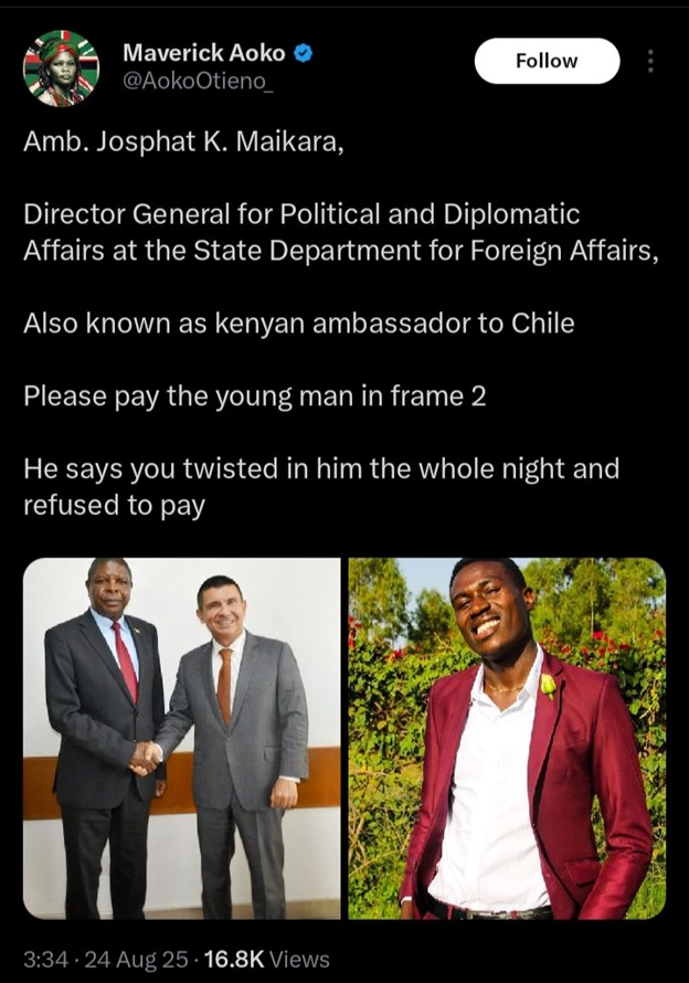 Sunday, August 24, 2025 – Kenya’s Ambassador to Chile, Josphat K. Maikara, is at the center of a fast-growing scandal after being accused by a self-proclaimed “Sim 2 guy” of refusing to pay for services rendered. The shocking allegations, first brought to light by outspoken blogger Aoko Otieno, have ignited heated debate online, with many Kenyans questioning the integrity of the top diplomat.