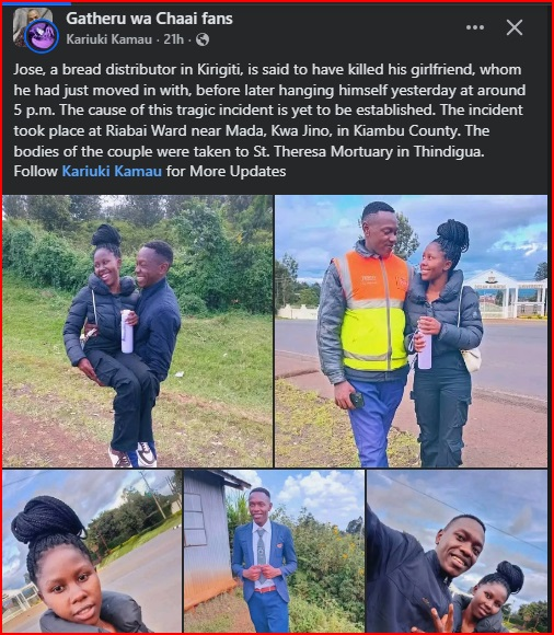 Kiambu County, Kenya – A somber mood has engulfed residents of Riabai Ward, Kiambu, after a tragic incident where a man identified as Jose, a well-known bread distributor in Kirigiti, allegedly killed his girlfriend before taking his own life.